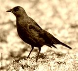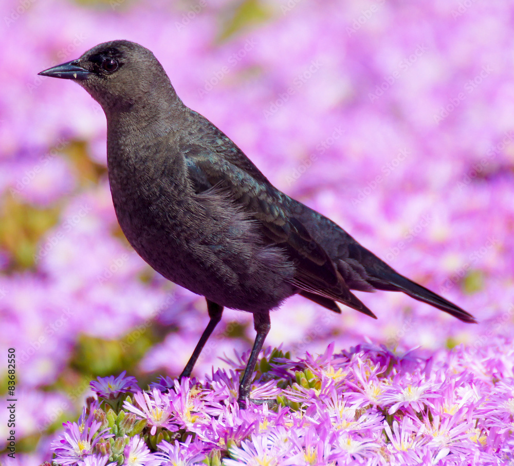 Common Grackle (Quiscalus quiscula) adult female foraging on pink flowers. Asilomar State Beach, Monterey County, California, USA.