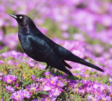 Common Grackle (Quiscalus quiscula) adult male foraging on pink flowers. Asilomar State Beach, Monterey County, California, USA.