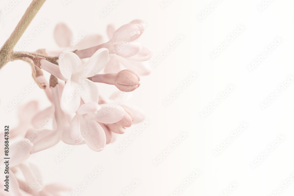 Pale vintage colors romantic pink lilac blooming flower on light white background and place for text macro