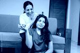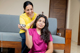 mother in a yellow top is sitting on a couch, happily massaging her daughter's scalp. T