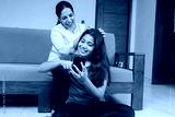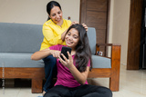 mother in a yellow top is sitting on a couch, happily massaging her daughter's scalp. The daughter showing her mobile screen