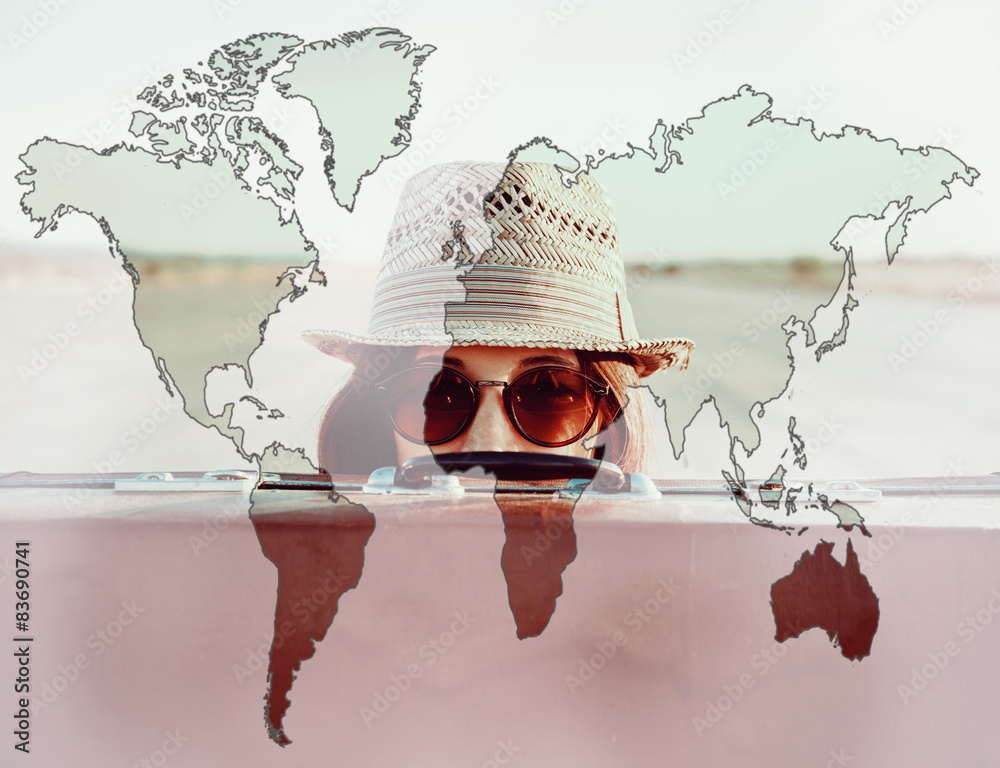 Double exposure map of world with traveler woman