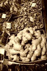 Radici di zenzero in una grossa cesta di vimini al mercato