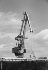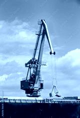 Port crane at work with the open grabbing bucket