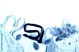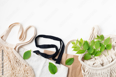 Plastic free set with various cotton bag decorated green leaves top view. Zero waste, eco friendly concept. Flat lay.