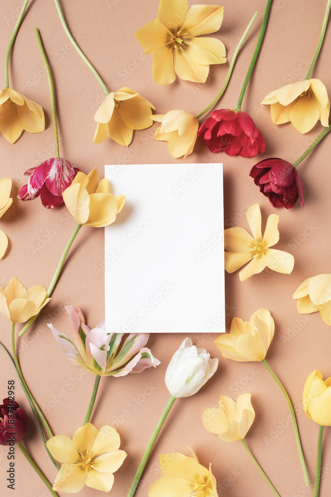 Beautiful aesthetic flowers with empty paper blank on neutral background top view. Minimal invitation or greeting card.