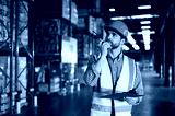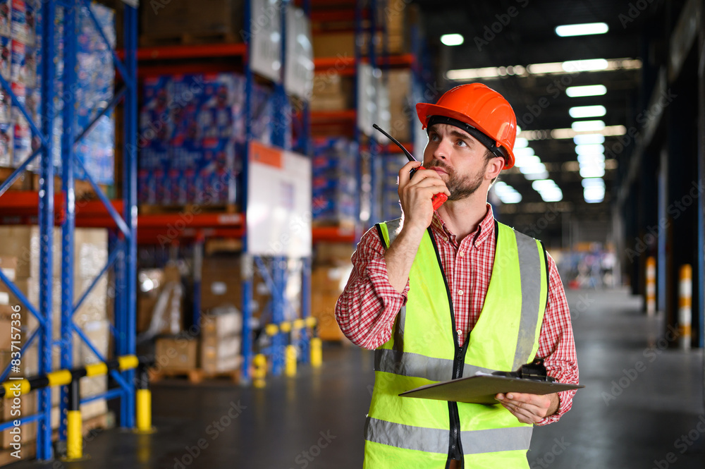 Factory worker man holding clipboard and using walkie-talkie while checking the stock order details and goods supplies in the workplace warehouse.