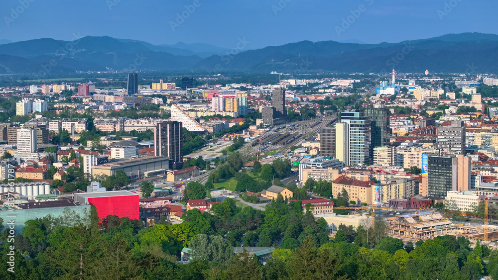 AERIAL: Lush greenery surrounds the red facade of a large brewery in Ljubljana.
