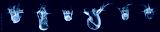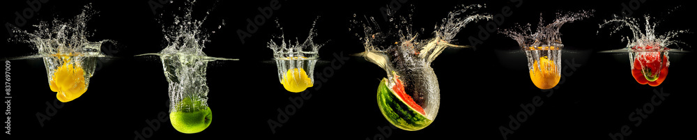 Group of falling fruits and vegetables in water with splash on black background