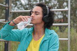 young man with headphones drinking after doing sports outdoors