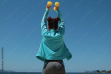 young woman on her back with dumbbells doing sports outdoors