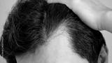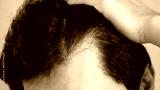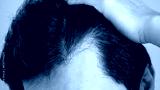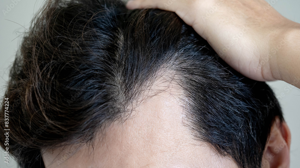 Hair loss or alopecia problem. Receding hairline. Closeup head of Asian man while raising up his black damaged hair showing bald head area.