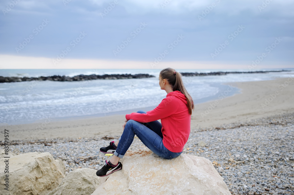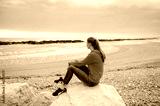 The girl sits alone ashore among stones