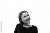 A fair-haired teenage girl dressed in a black turtleneck looks pleased
