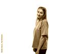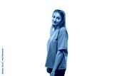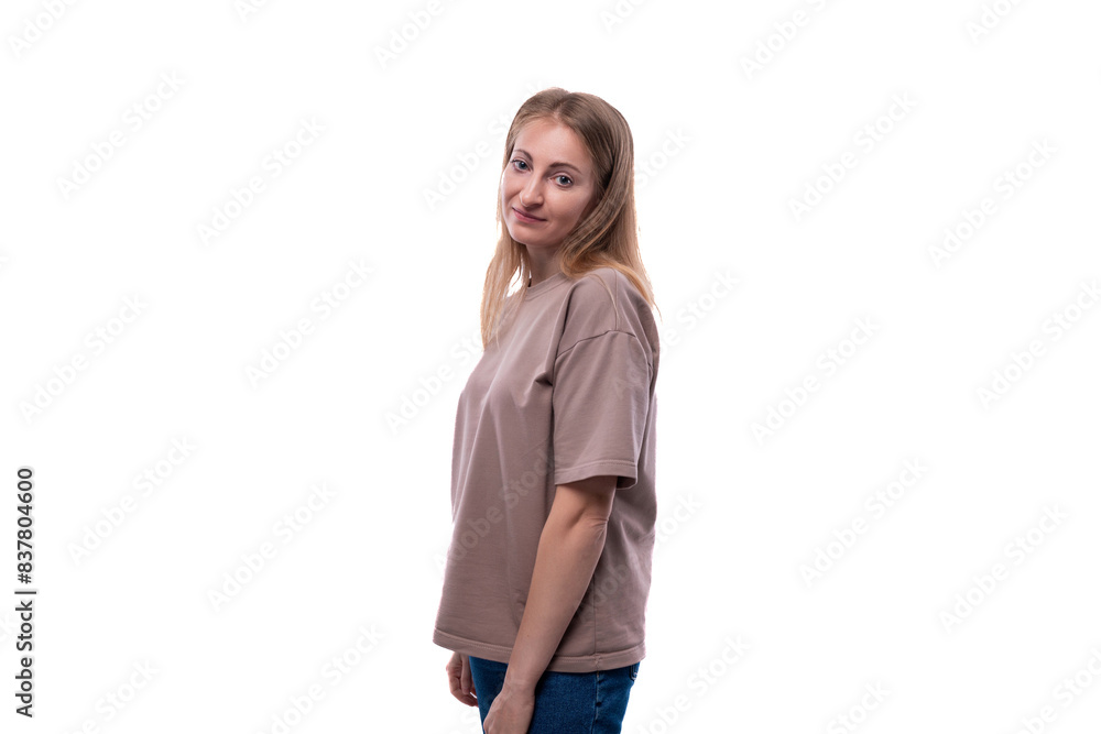 Close-up of a Caucasian blond woman wearing a T-shirt on a background with copy space
