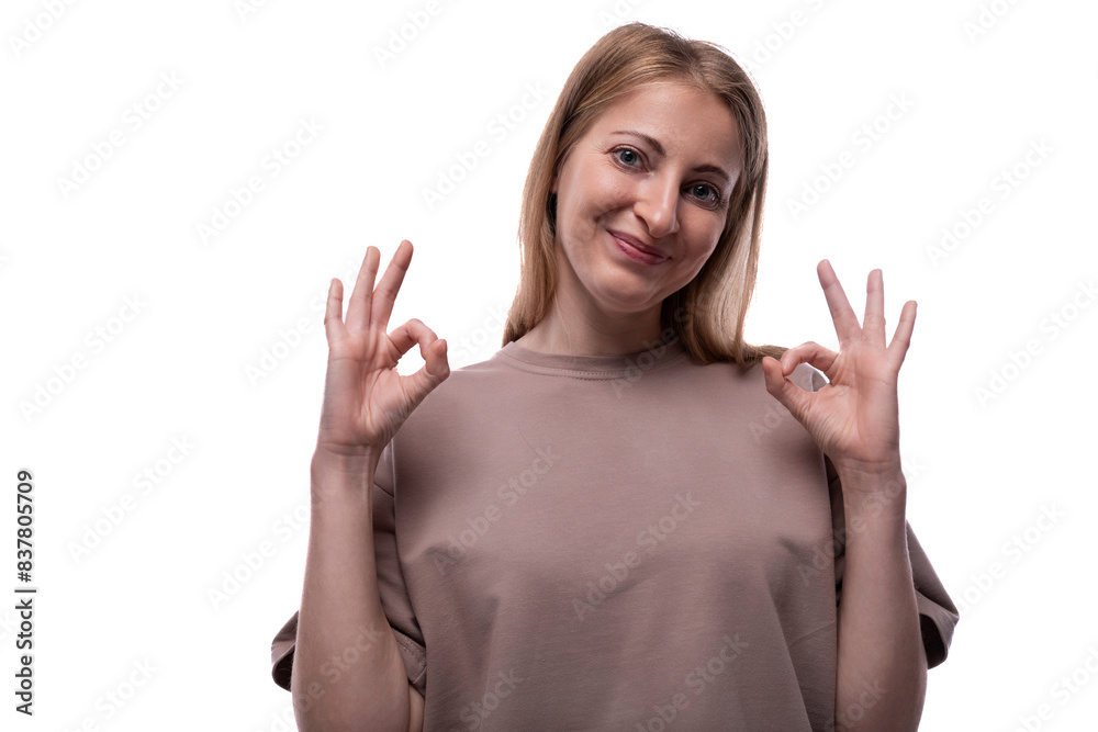 A 40-year-old woman with thin white hair wearing a T-shirt in front of a copy space background