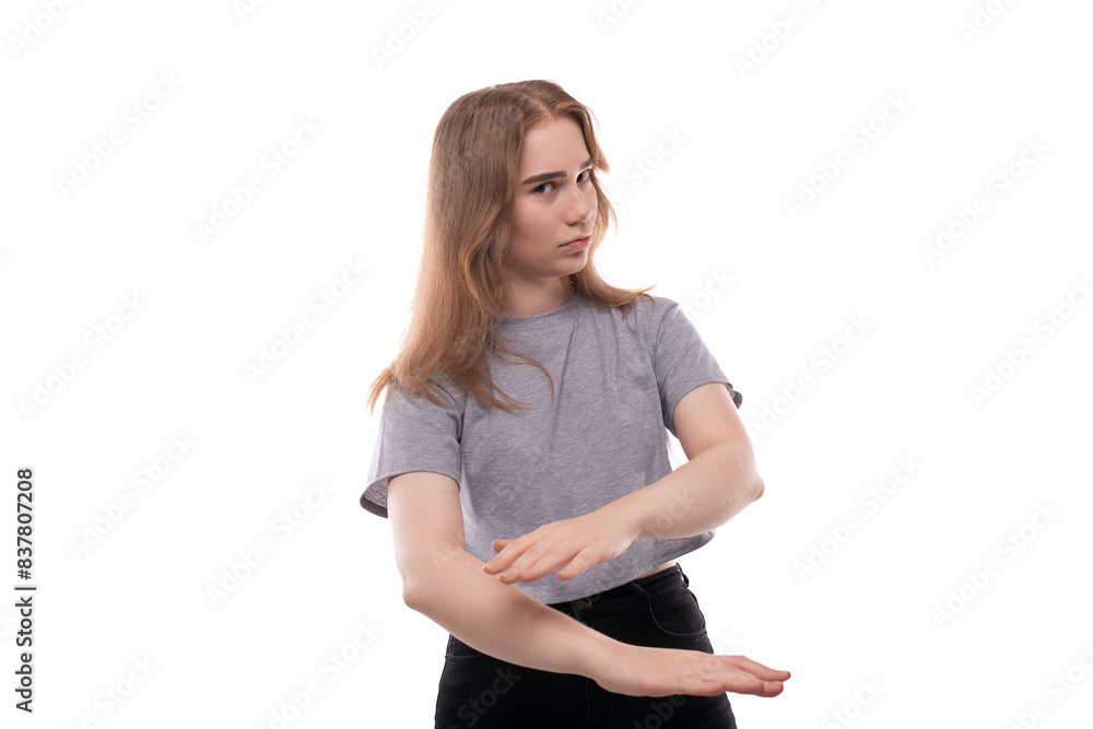 European doubting teenager girl in a gray T-shirt with blond hair on a white studio background
