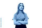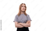 Portrait of a confused teenage girl with blond hair in a gray T-shirt on a white background