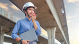 Asian female engineer using walkie talkie at construction site Standing near the concrete road, highway bridge.
