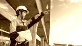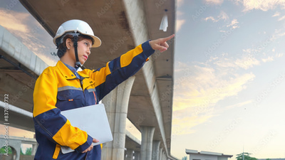 Asian female civil engineer using laptop computer standing on road construction site to supervise the construction of a new road.
