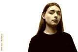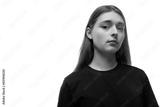 Close-up portrait of a kind 15 year old Caucasian girl with blond hair on a white background