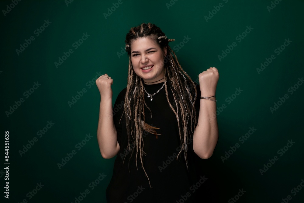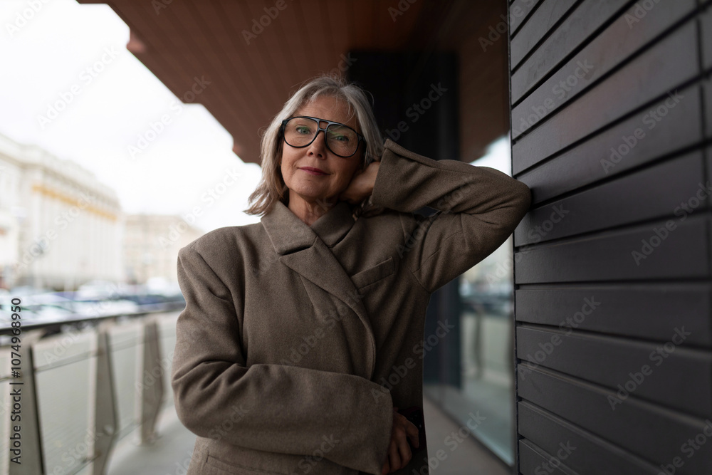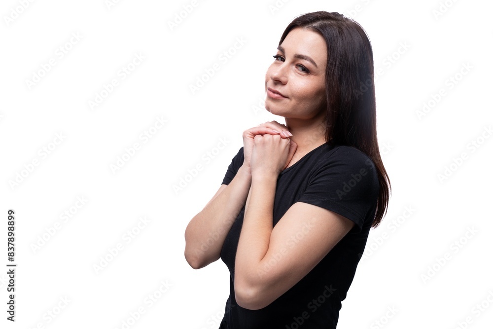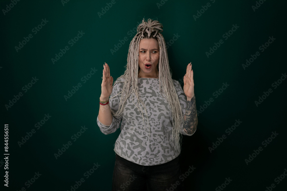 Mature blond woman dressed in a gray blouse crossed her fingers in anticipation