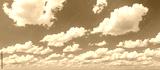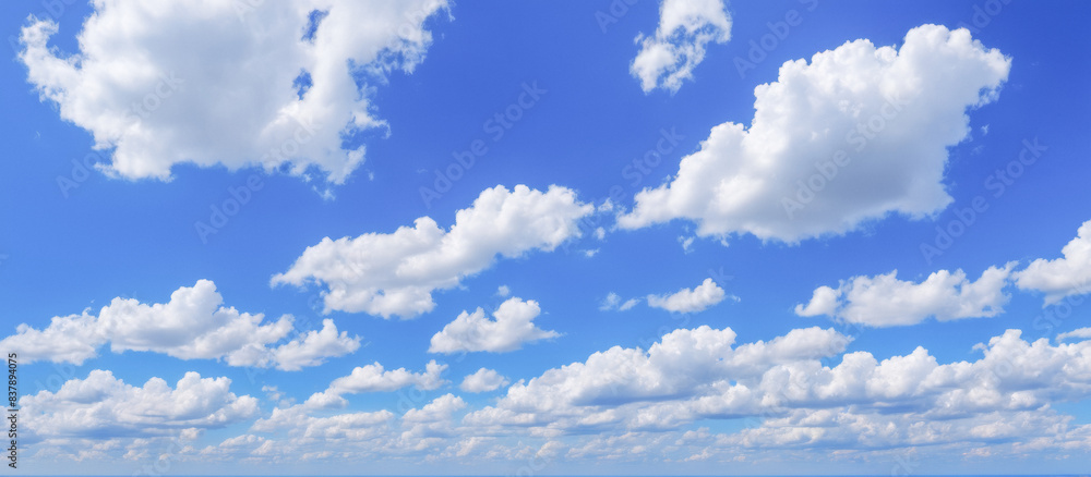 Panoramic blue sky with white clouds, serene day, fluffy cumulus formations spread across bright azure backdrop, ideal for wallpaper or tranquil nature scene