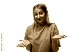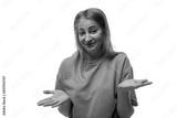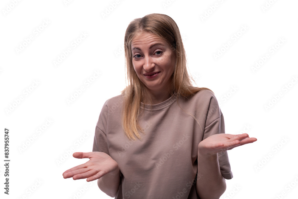 Portrait of a pensive Caucasian blonde woman in a T-shirt with bright facial expressions