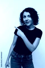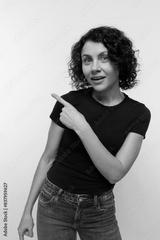 An adult brunette woman with a curly bob hairstyle points her finger to the side