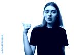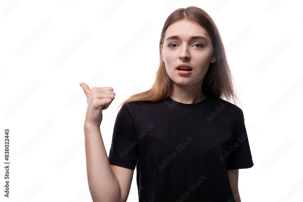 European cute schoolgirl girl with blond hair in a black T-shirt points her finger to the side