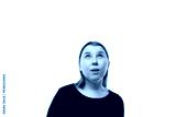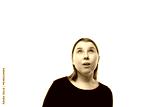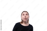 Close-up portrait of a surprised fair-haired 12 year old girl on a white background