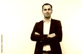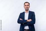 A 40-year-old successful brunette man dressed in a blue jacket is proud of himself