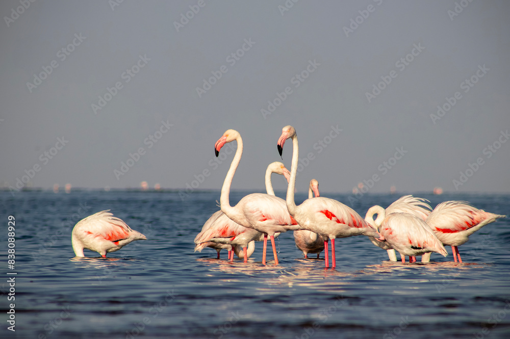 Wild african birds. Group birds of pink african flamingos walking around the blue lagoon on a sunny day
