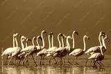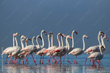 Wild birds. Group birds of white african flamingos walking around the blue lagoon on a sunny day