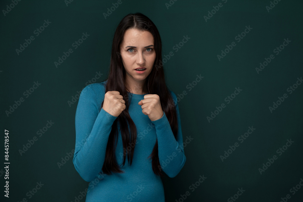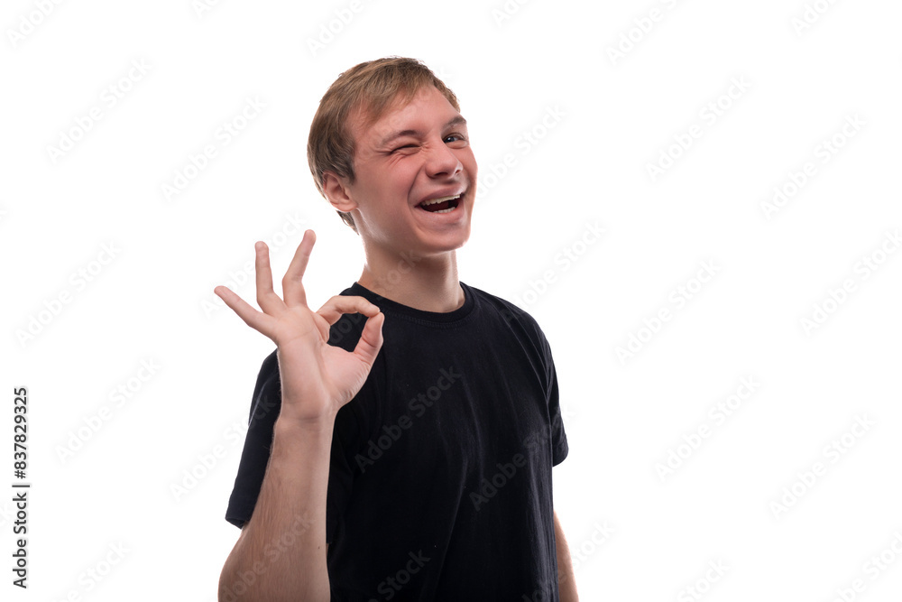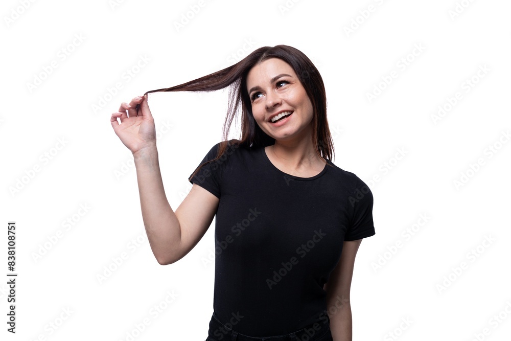 Young slender brunette woman with straight short hair wearing a black T-shirt