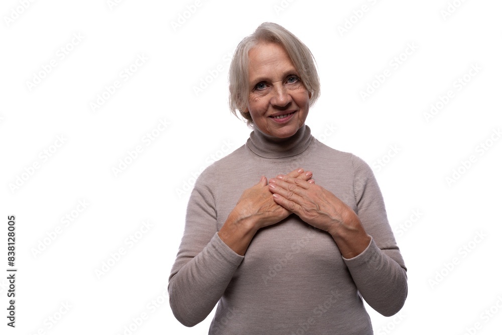 Elderly kind woman with gray hair on a white background
