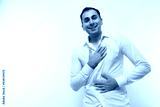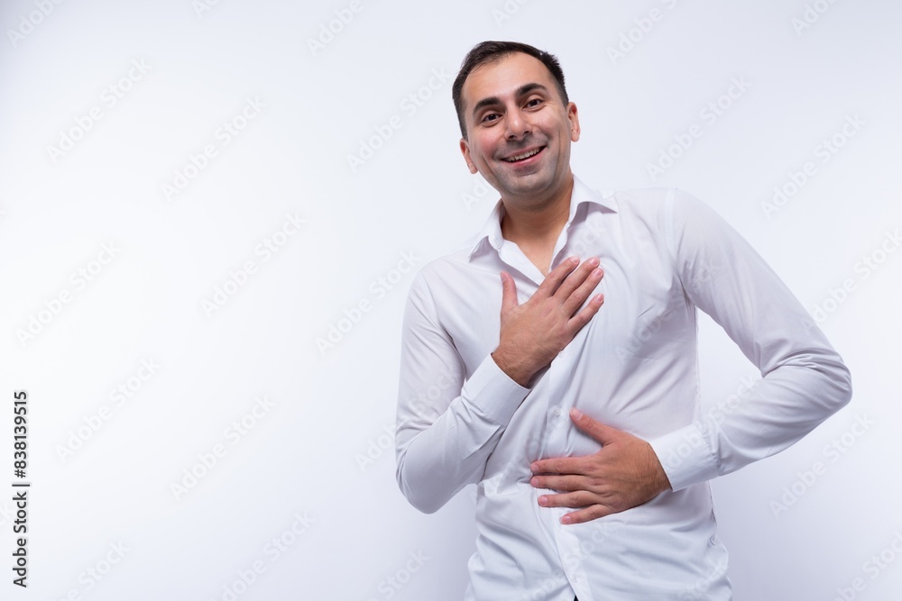 Portrait of a European brunette man in a white shirt on a background with copy space