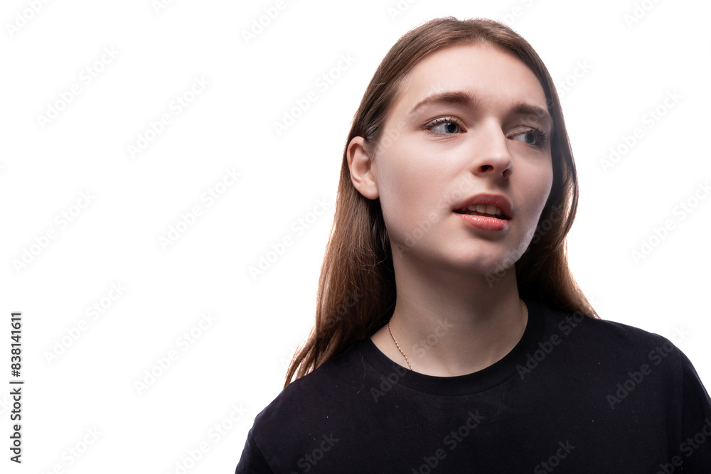 Close-up portrait of a teenage girl with light brown silk hair looking into the distance