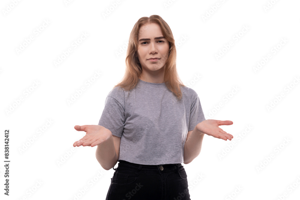 Puzzled bright blonde teenager girl with braces in a gray T-shirt is thinking about an idea