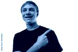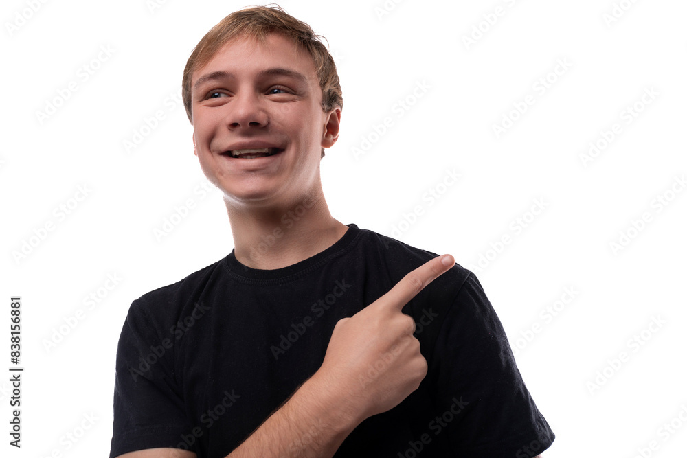 Positive teenager guy in a black T-shirt holds his index finger up on a background with copy space