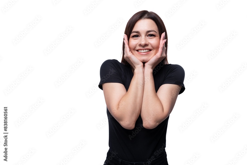 25 year old cute woman with straight black hair is surprised on a background with copy space