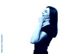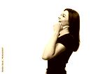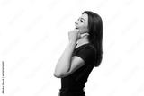 Young surprised woman with brown eyes dressed in a black T-shirt on a background with copy space