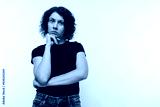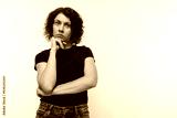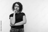 Adult curly European woman wearing a black t-shirt inspired by an idea