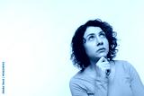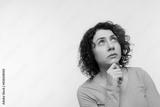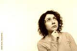 Brunette with curled hair thinks and looks up, studio photo from copy space