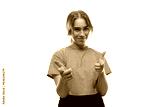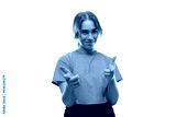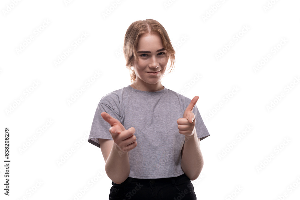 Beautiful fair-haired teenage girl in a gray T-shirt against a studio background