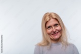A mature blond woman dressed in a gray blouse is modest against a background with copy space