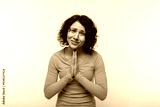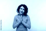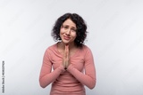 Portrait of a curly woman with a short haircut in a pink blouse begging to keep a secret