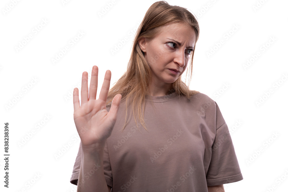 European excited adult woman with blond hair on white background