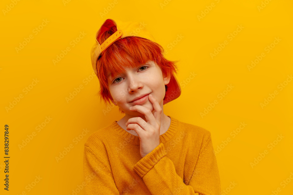 red-haired teenage boy in cap smiling on yellow isolated background, cheerful child with orange hairstyle and hat looking at camera