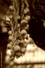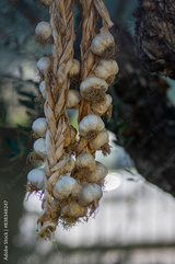 Group of garlic fruits hanging together in bunch, drying cuisine healthy seasoning hot ingredients